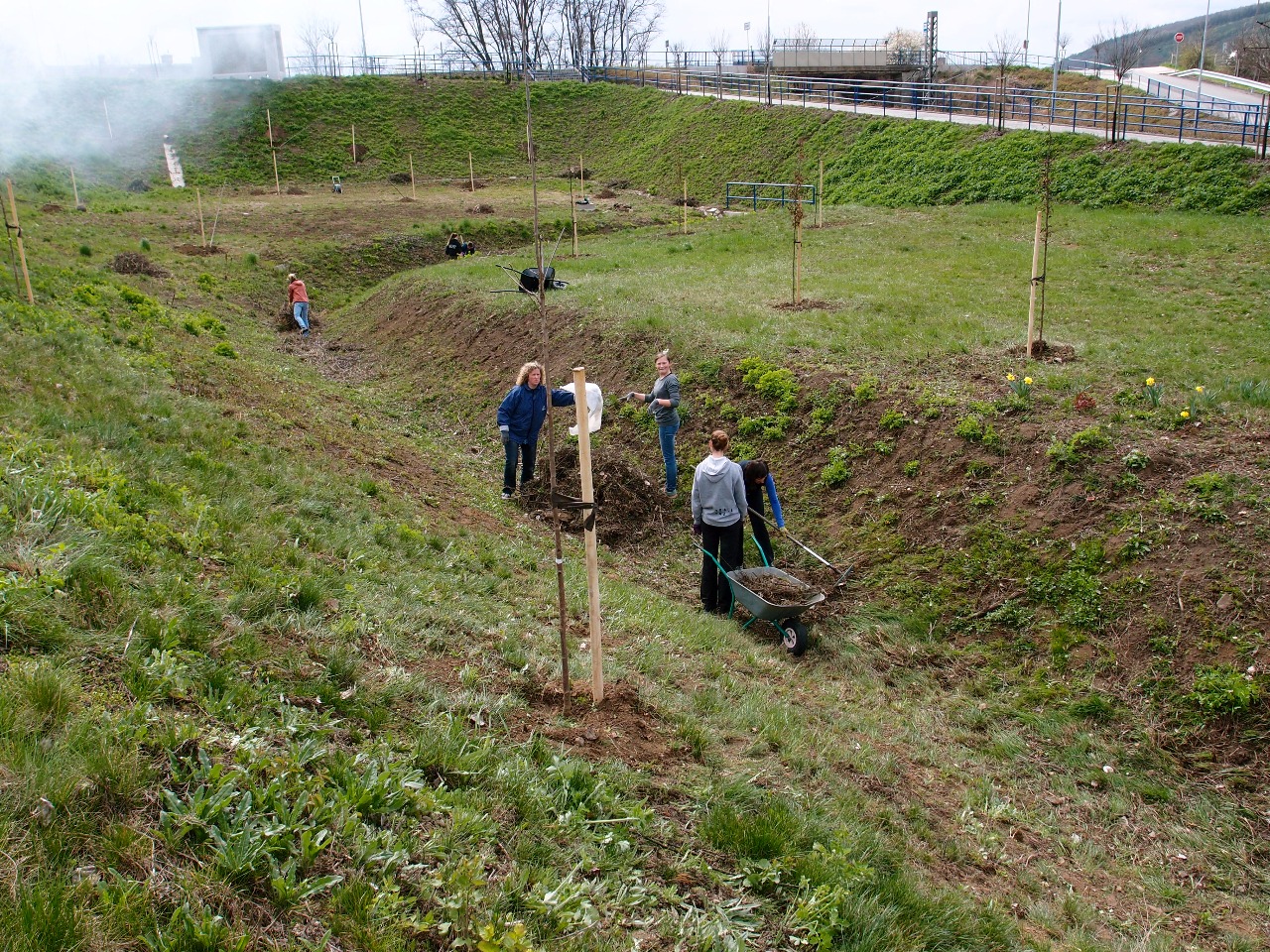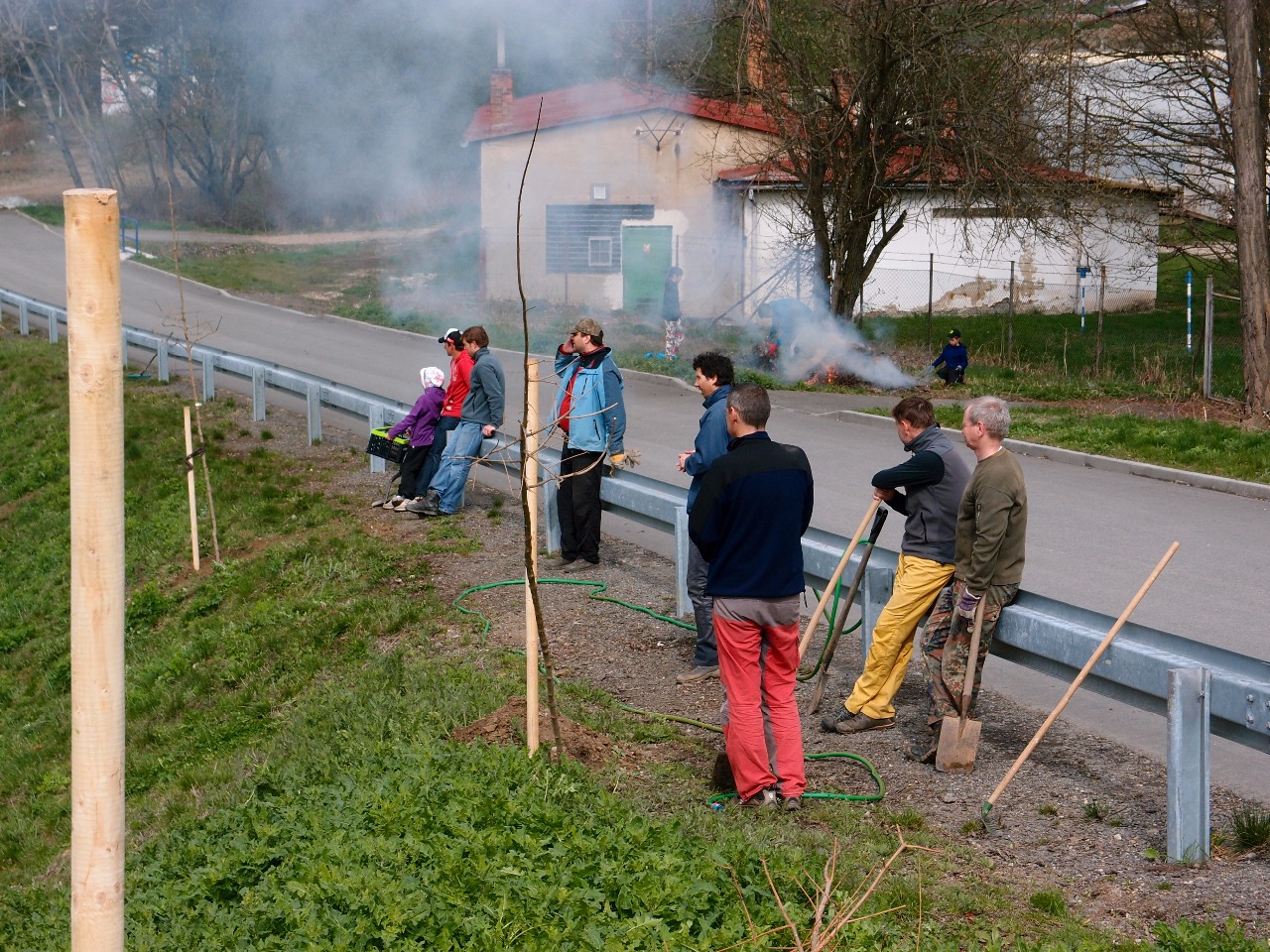 Po domluvě s panem starostou nám paní archtektka Wagnerová navrhla vhodné druhy stromů, jejich počet a umístění. Obec stromy zaplatila, pan strosta domluvil s dráhami, že na jejich pozemku můžeme výsadbu provést a domluvil náklaďák z Apexu na dovoz stromů z nedaleké školky v Hradčanech. Apex dokonce poskytl náklaďák v rámci dobrých vzahů bezúplatně.