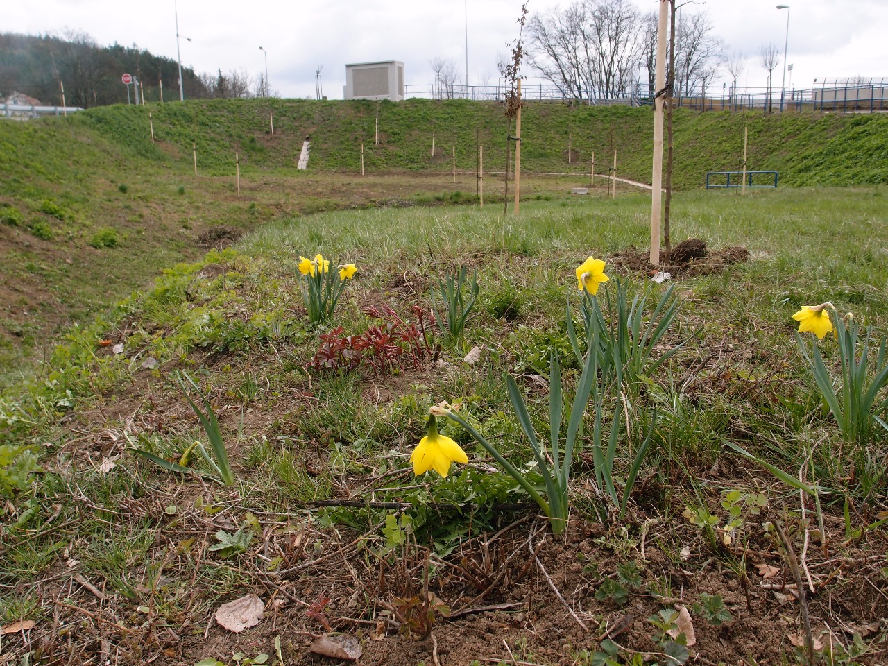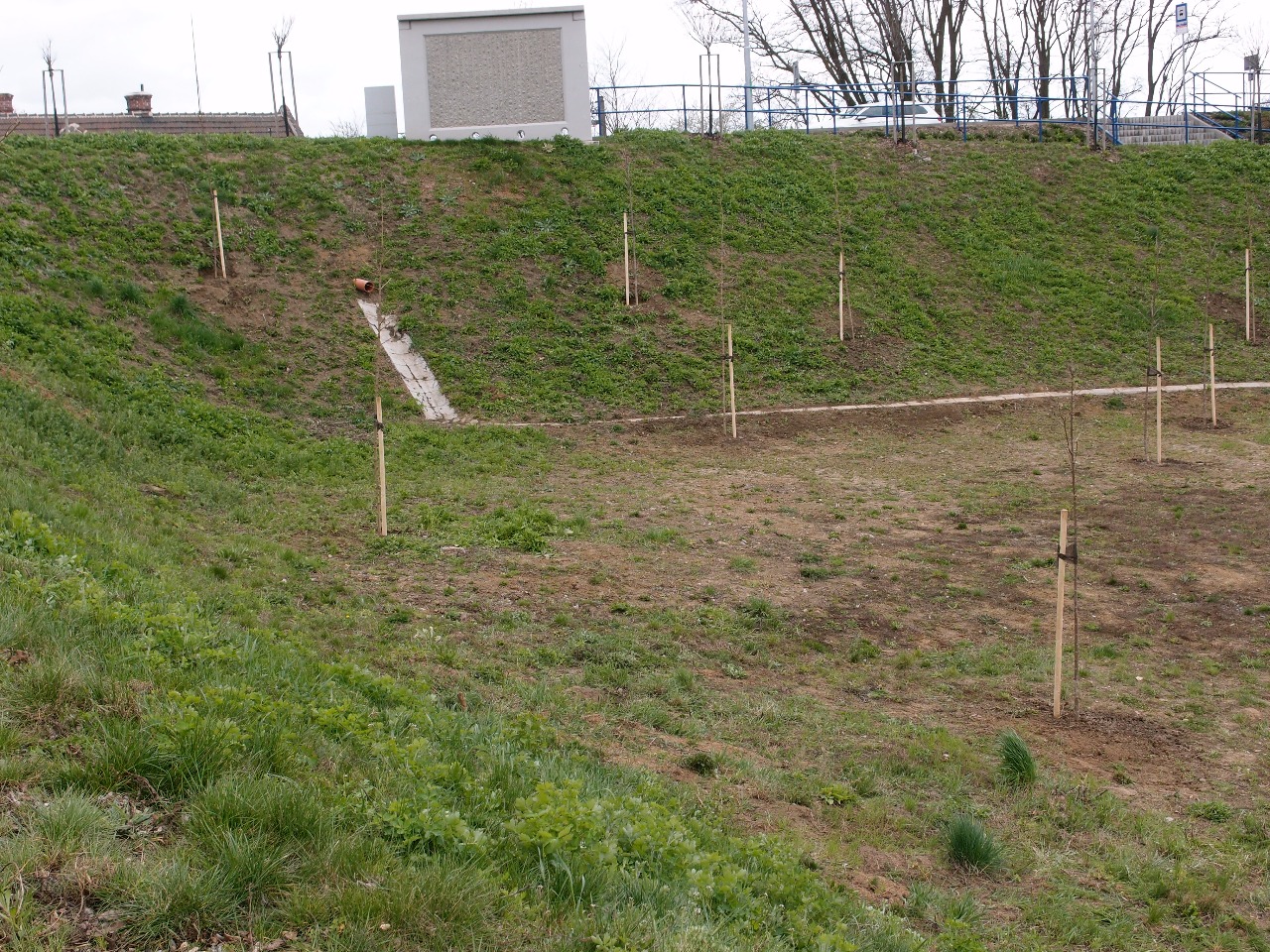 Po rekonstrukci nádraží zůstala celá velká plocha mezi příjezdovou komunikací a přístupovým chodníkem sice upravená terénně, ale nijak neoživena vegetací.